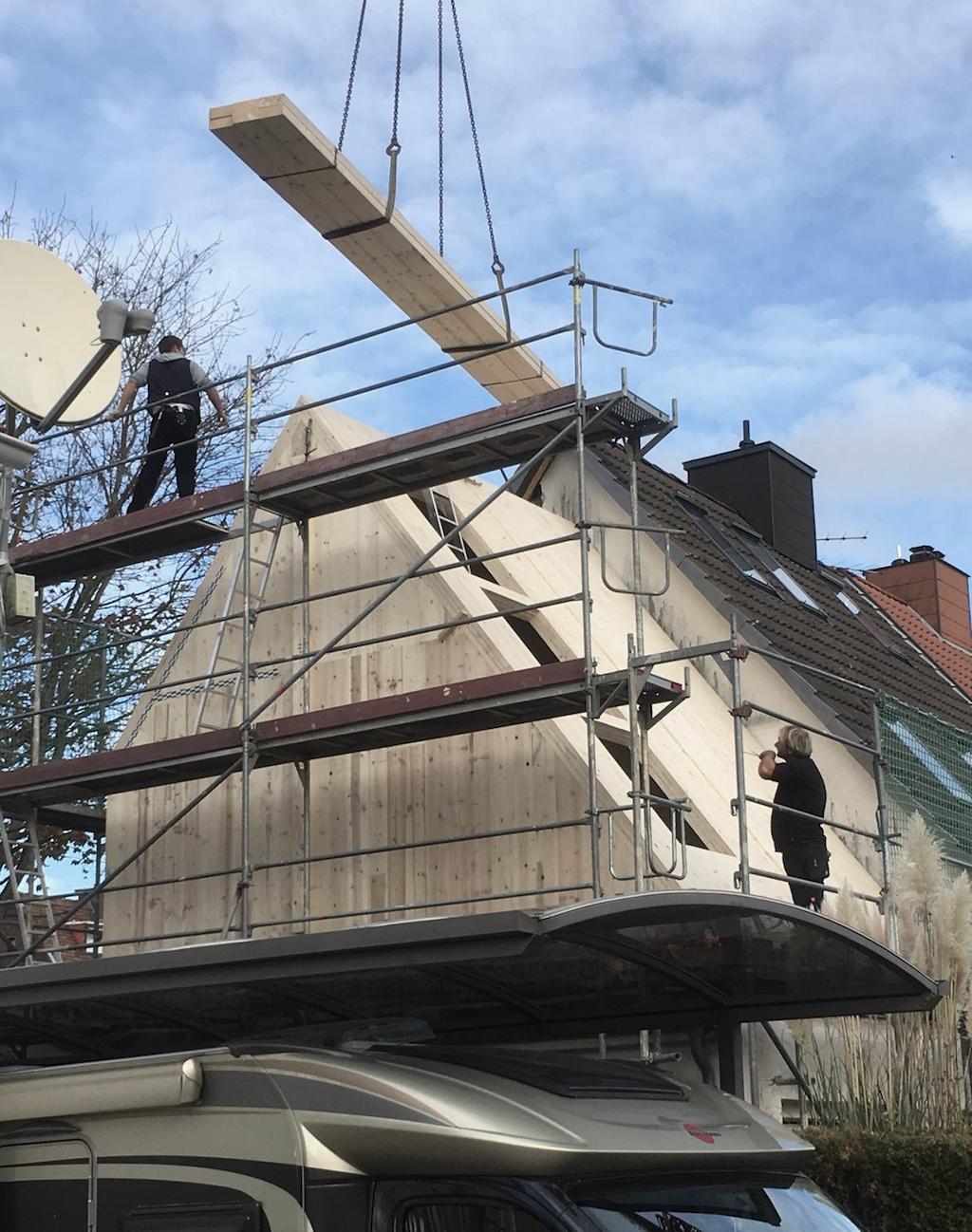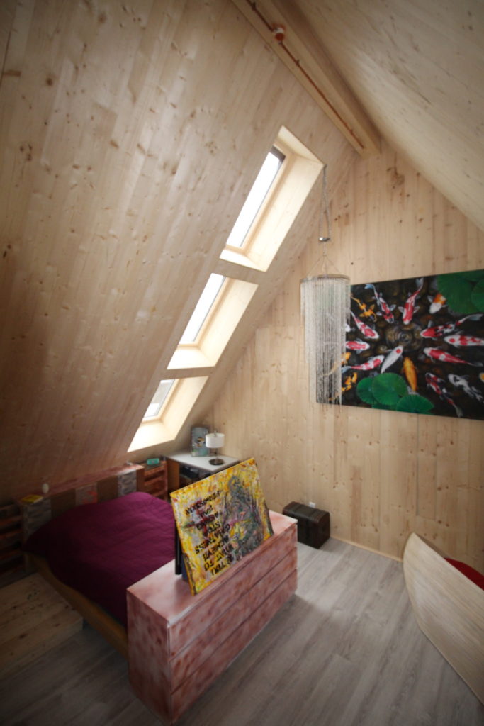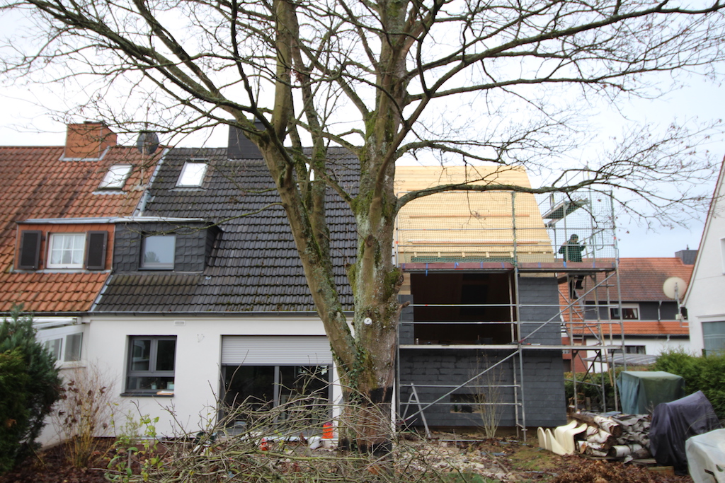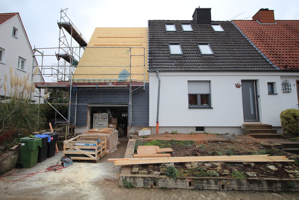 Ja – es ist Zeit für Mundart. Ein Anbau für schweizer-saarländische Bauherren von Architekt mit schwäbischen Wurzeln, nun denn, jeder sucht sich aus was am Besten klingt… ich finde schwyzerdütsch ganz nett an der Stelle. Wie auch immer trifft es den Kern des Projektes – in jeder Hinsicht. Dieser wurde entnommen, herausgezerrt, oder elegant heraus gezogen? Das Innere tritt nach aussen, zeigt sich in seiner Kernflanke, der Abrisskante rundum in dunkler, schuppiger Gestalt- Auf der Giebelseite ist alles geblieben, weiß verputzt, als wäre nichts geschehen. Der Effekt liegt dem in der Umgebung fast schon üblichen Wunsch nach mehr Platz zugrunde, hier nach einem Raum mehr. Die Siedlungshäuser aus den 1950er Jahren waren enger gestrickt als die Familienbedürfnisse es heute erwarten. Dadurch wurde auch hier im Innern des Bestand Gebäudes erweitert und ergänzt, sowie Räume durchbrochen um in Kombi mit dem ‚Herausgezogenen’ den Platz und den Komfort zu erreichen. Durch ein ehemaliges Fenster als Tür tritt man ein paar Stufen hinab und steht in dem spitzgiebeligem Einraum als ‚Häusli’ ganz in unbehandeltem Holz, welches den Zweck des Schlafzimmers als Nutzung recht gut dient, durch seine Eigenschaften in klimaregulierender Hinsicht. In dieser speziellen und beruhigenden Umgebung mit einem Blick in den Garten auf einem wunderbaren, alten Baum lässt das Verweilen im Innern gerne auch den eigenen Kern suchen und vielleicht …