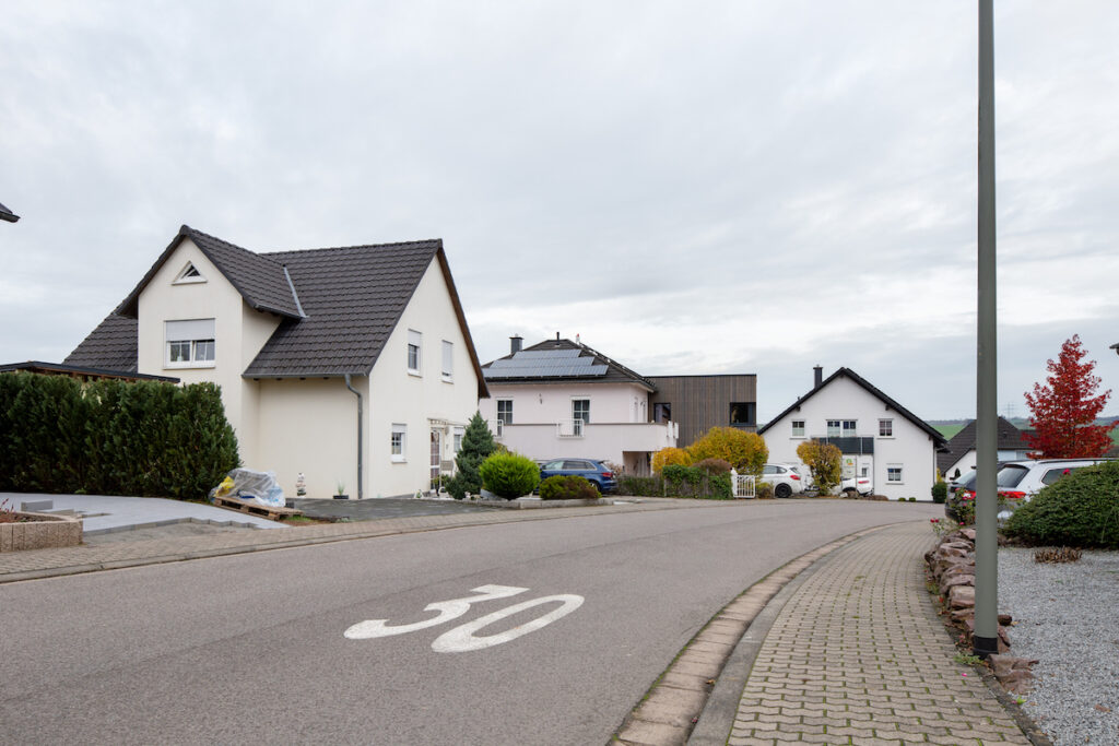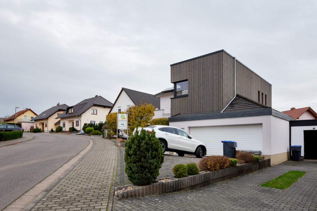 Der Titel ist Programm, mitten in einem Wohngebiet mit recht eingängig durchgestalteten ggf. von der Anmutung eher in die Toskana passenden Wohnhäuser auf dem schön gelegenen Hügel in Lebach, erlauben wir uns einen Bruch, oder vielmehr wie in der Geschichte der ‚Invasion Ztadudre‚ beschrieben, sogar einen echten ‚Einschlag‘ aus dem All, die ‚Impakt Nova‘. Denn wie soll es auch anders sein, einpassen in diese Umgebung mit flachen Walmdächer und zinnenförmige Balkonbrüstungen? Nein. Vielmehr schneidet sich die lange Kisten klar in die Struktur der Walmdachgarage und schmiegt sich an das Haupthaus an, mit vertikalen Latten in elegantem Grau bekleidet, wirkt es am Ende zwar konträr, aber doch so als müsste es schon immer so aussehen. Spektakulär Sekundär sozusagen… Wir danken sehr für den Mut der Bauherren für diesen klaren Ansatz und freuen uns mit daß die Ausserirdischen solch eine Besiedlung hier abwerfen durften 😉