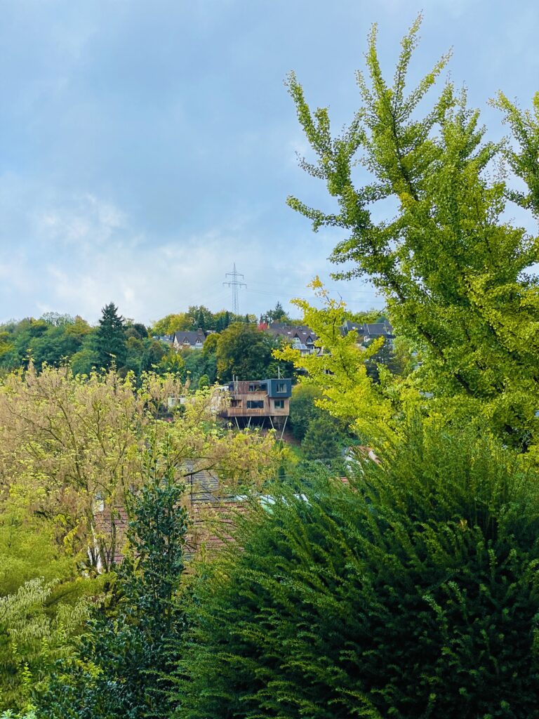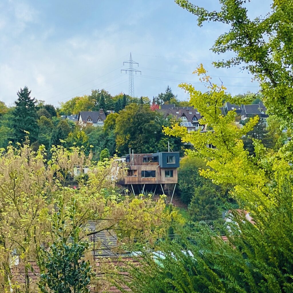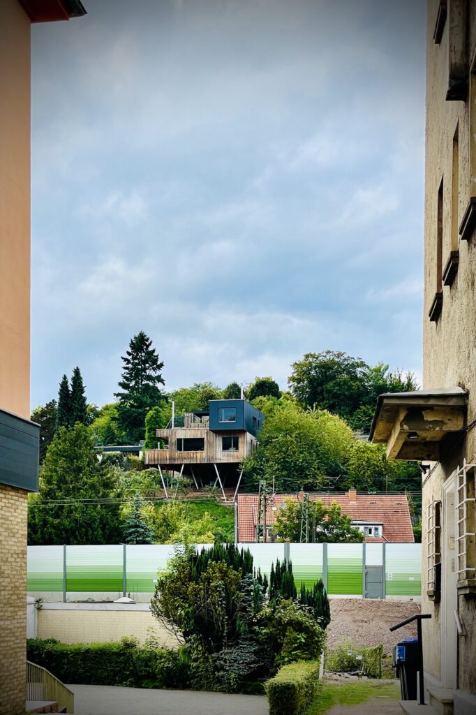 Vermeintlich wie eine in hochalpinen Gelände liegende Bergstation lässt es uns die Blicke ins Tal geniessen. Auch wenn weniger alpin desto kurioser geht es inhaltlich drei mal hoch: in der Mitte liegt das barrierefreie Geschoss für die Bauherrin, darüber und auch ganz für sich fügten wir dem Bruder der Bauherrin eine weitere ,Kiste’ hinzu, die sich nicht nur herausragend bewohnen lässt dort oben, sondern auch etwas kühn herausragt überm Darunter.