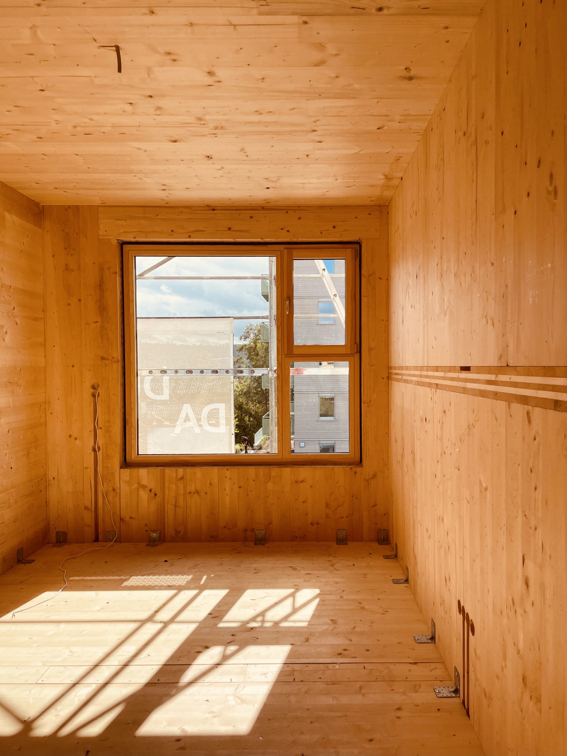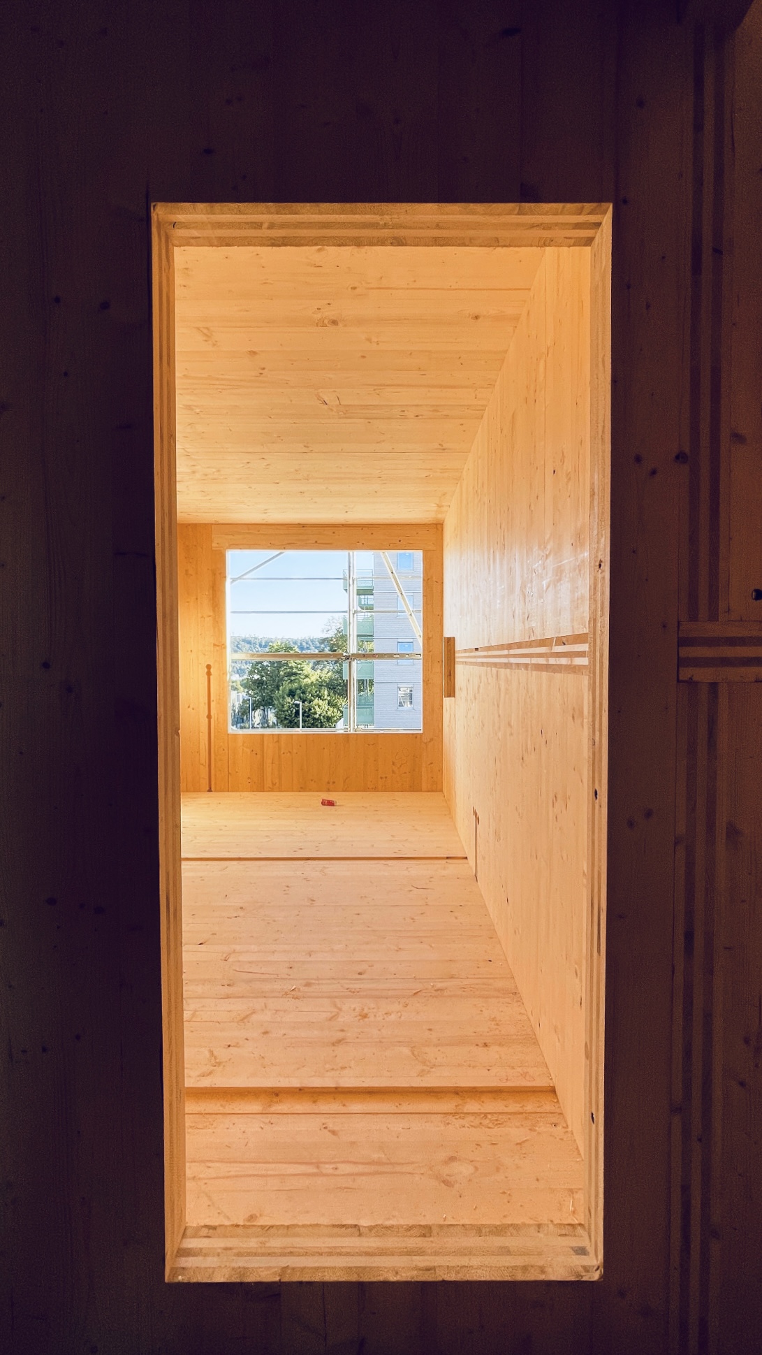 In Folge des Raum Tetris im Innern, spielen auch die Fenster verrückt auf der Fassade. Dem entgegen setzen wir noch eine stringente vertikale Fassade mit Holzbohlen, welche sich rhythmisch alle paar Stück hervorheben in der Dicke… sodaß auch hier in der schönen Linearität nicht vergessen wird, den Raum zu ,verrücken’.