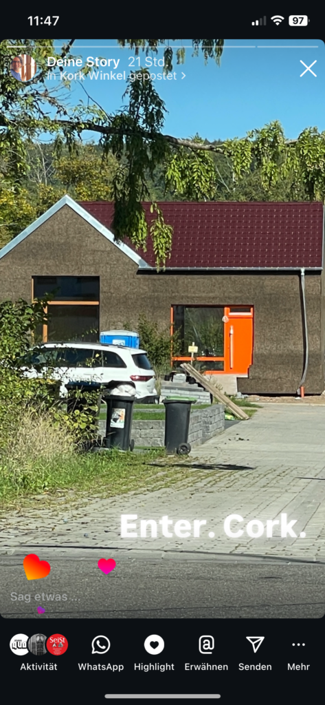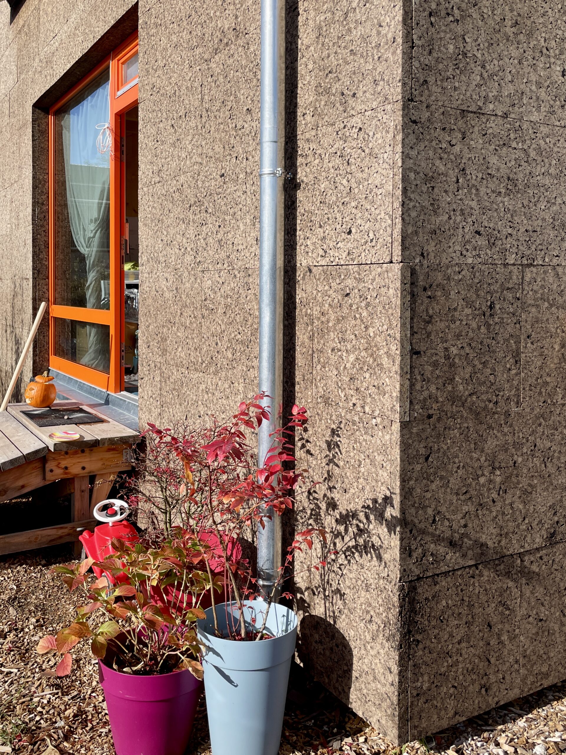 Einfach könnte man auch die Fassade benennen, denn ohne Verputz, besticht der Baukörper durch seine Kork Fassade, mit den stupf gestoßenen Platten an der Außenseite zeigt sich auch hier der puristische Ansatz, als wäre das Haus aus einem Baum geschnitzt, im Innern mit dem massiven Brettsperrholzstamm, und Außen die Rinde aus Kork…