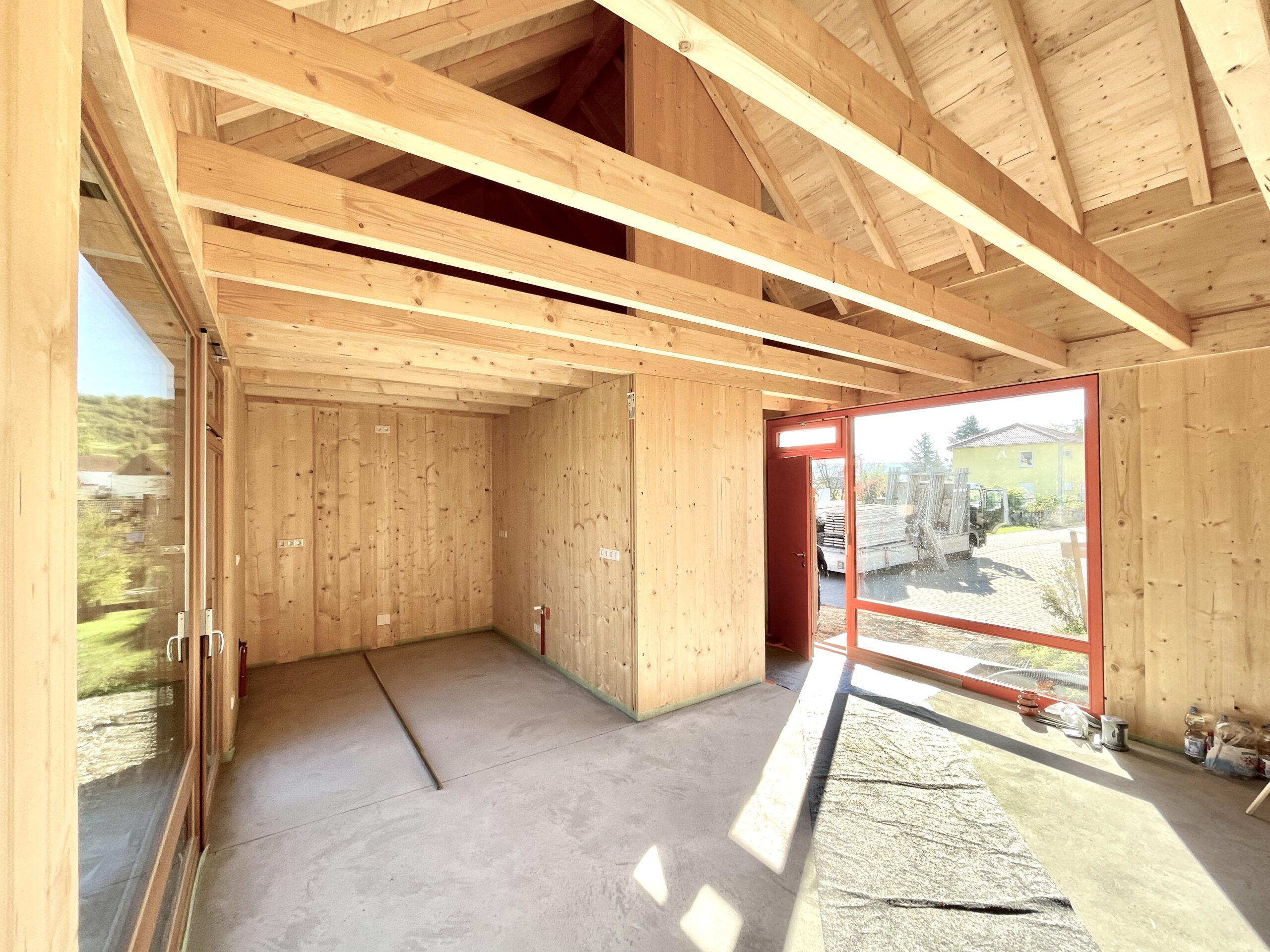Aus dem ,Einfach’ wurde am Ende auch wirklich diesmal ein konsequentes Umsetzen von Prinzipien, die wegweisend in nachhaltigem und puristischem Bauen sind. Gegründet auf Schraubfundamenten musste kaum Erde bewegt werden und wir konnten dann naturschonend und rückbaufähig ein Baukörper in Mischkonstruktion mit ,Bodendecke’ und Decke/Dach mit Holzbalken und Wänden aus Brettsperrholz daraufsetzen. Im Innern bleibt so viel wie s geht sichtbar vom Holz und selbst der sauber eingebrachte Zementestrich wurde von den Bauherren am Ende lediglich gut geölt und gibt dem Haus seinen starken Charakter der ehrlichen Materialien.