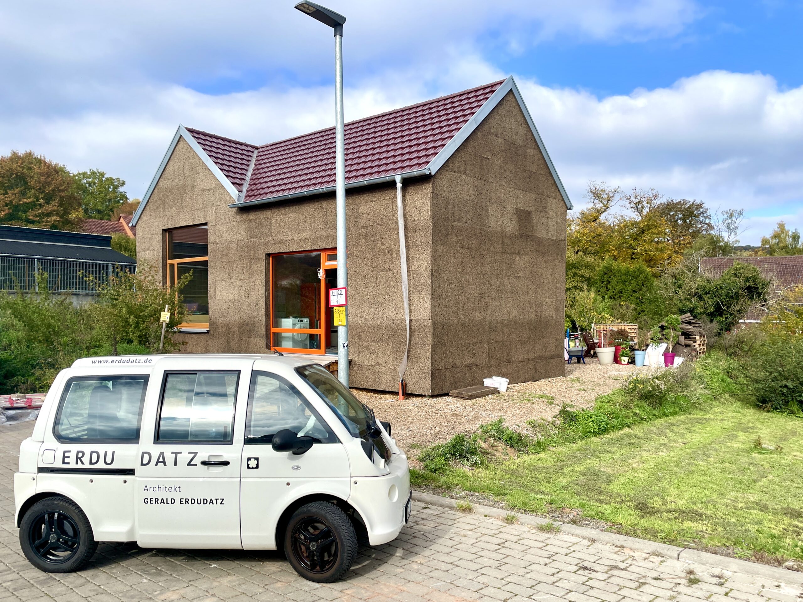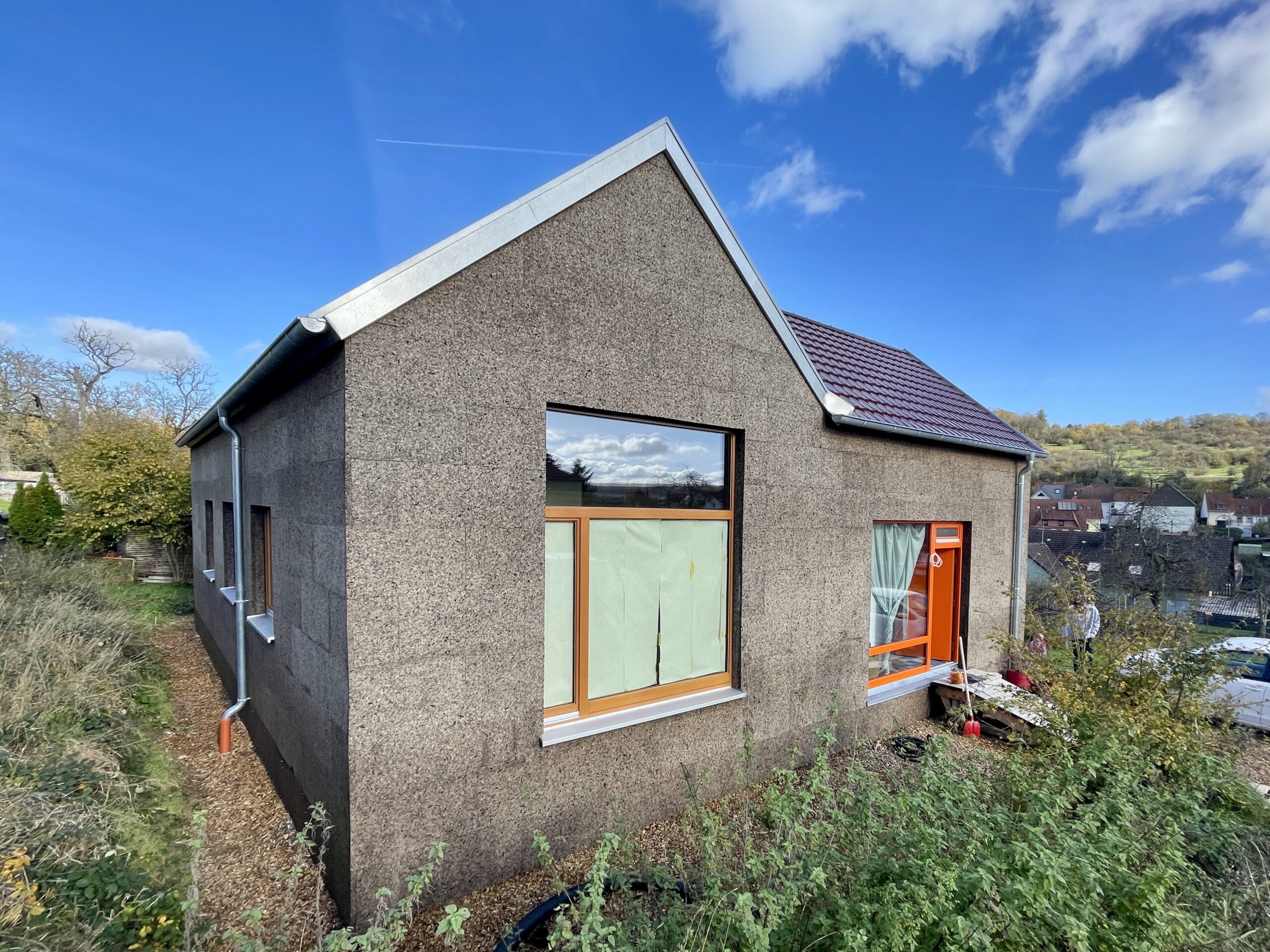 Winkel Einfamilienhaus in nachhaltiger Holzbauweise auf Schraubfundamenten, mit Korkfassade, im Bliesgau, Saarland