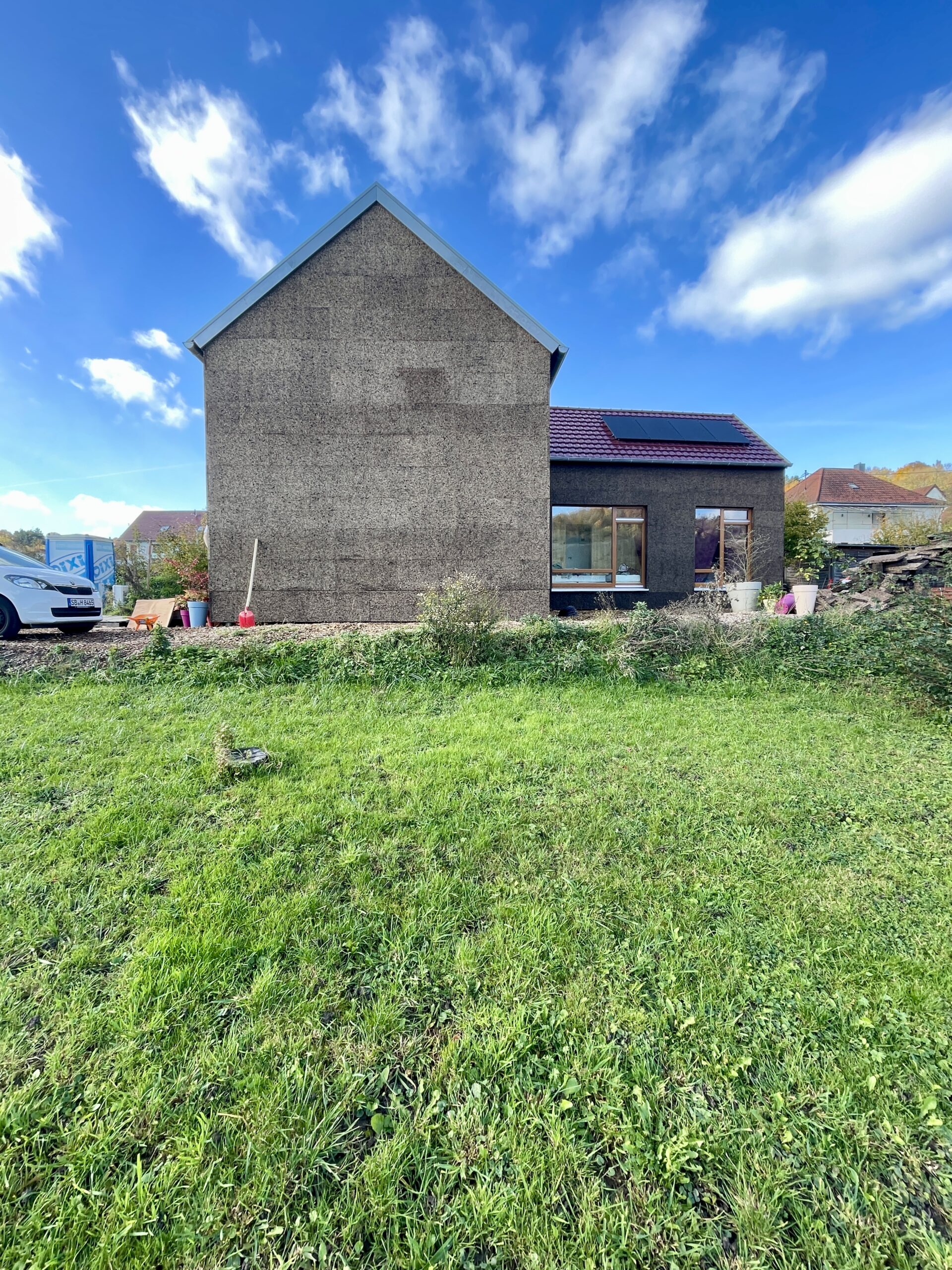 Da es in Zeiten von Pinterest und Co nun ein paar Durchläufe mit anderen Projekten noch gebraucht hat, hat sich nun hier endlich eine Familie getraut. Denn die vorgenannten Möglichkeiten alles heutzutage im Internet zigfach anzuschauen als Referenz, macht es nicht immer leichter… das Fassadenmaterial ist speziell, denn es lebt mit seiner Optik seine Umgebung. Hellt sich über die Jahre in der Sonne auf, die Fugen werden gut sichtbar und nach einem Schlagregen oder bei Reife im Winter bleibt noch lange das Bild von der Witterung geprägt danach über den Tag…